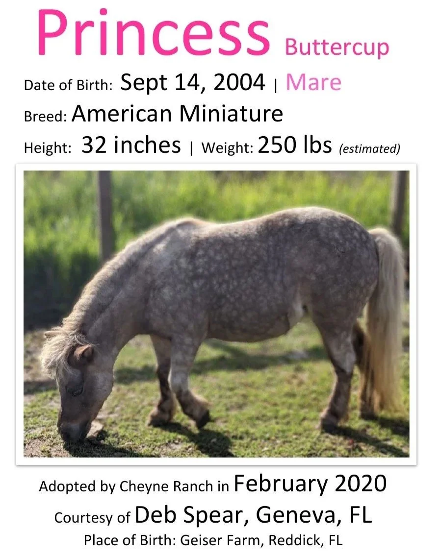 Princess Buttercup arrived at our barn on February 16, 2020. She came from a family in Geneva, FL. Princess Buttercup is a registered miniature horse, a Chocolate Palomino mare. When we body-clipped Princess, we discovered she has a hidden silver dapple gene! Princess Buttercup was born September 14, 2004.